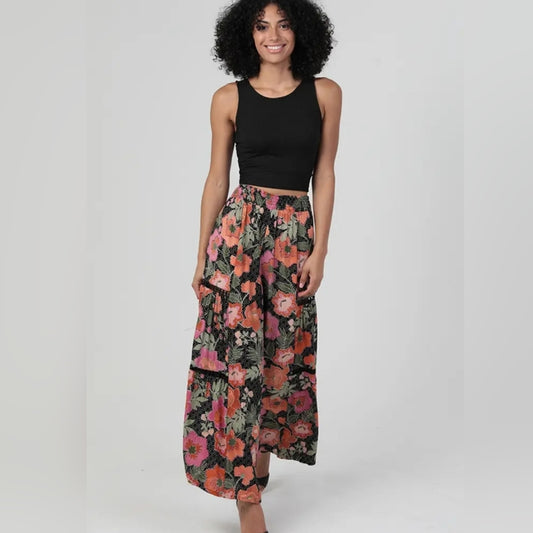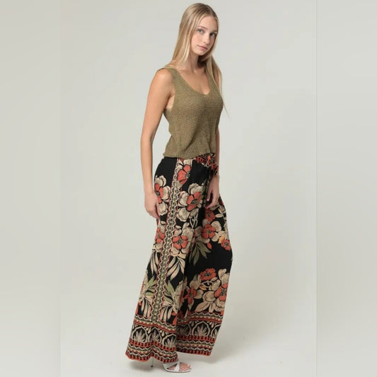 Angie Black and Pink Floral Wide-Leg Pants