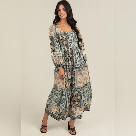 Angie Floral Maxi Dress in Green and Cream