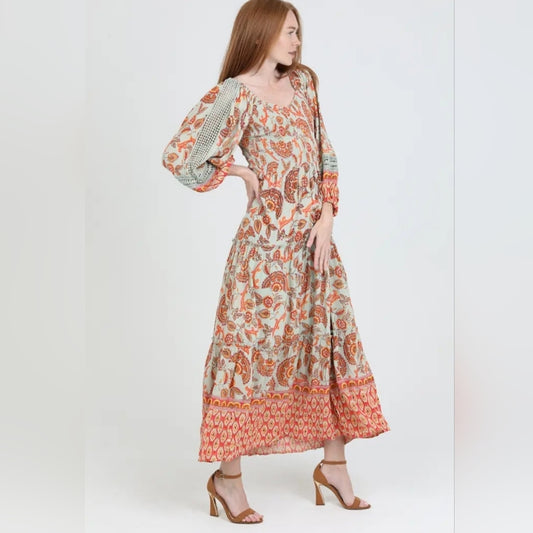 Angie Orange and Cream Paisley Maxi Dress