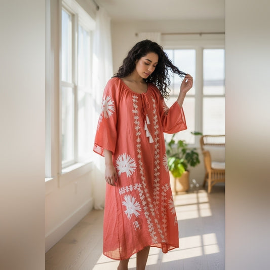 Floral Kaftan Dress with Pink Embroidery and headband