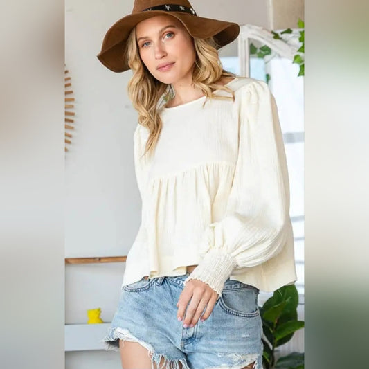 Cream Ruffled Long Sleeve Boxy Blouse