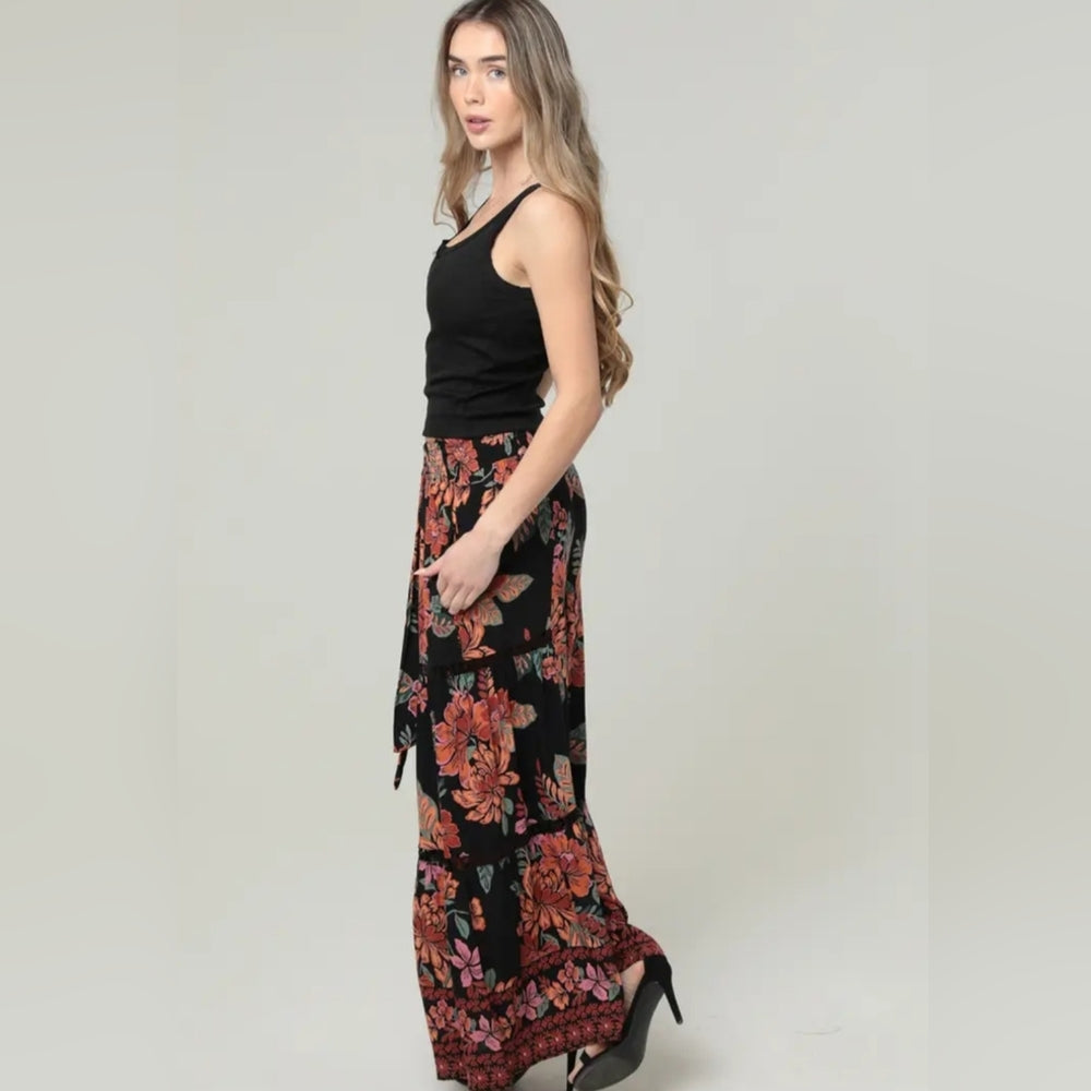 Stylish wide-leg pants with vibrant floral design. Comfortable and elegant for any occasion.