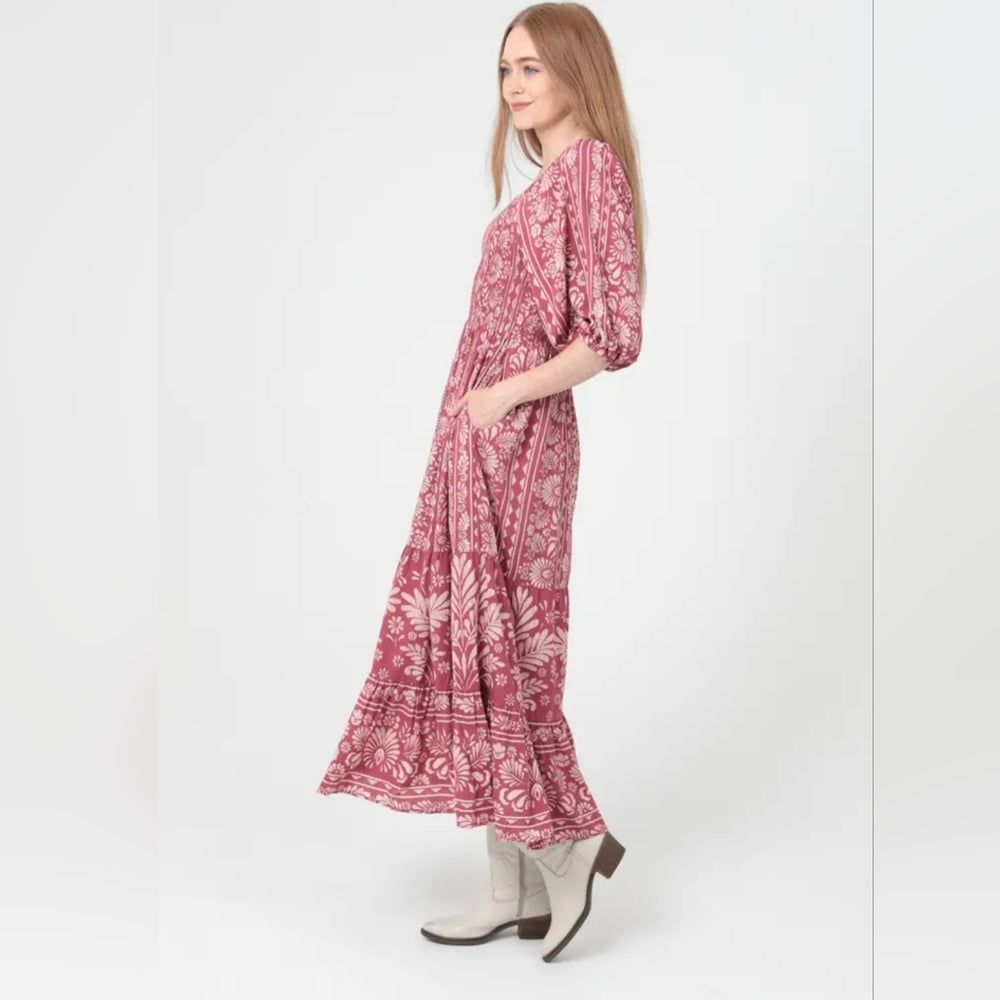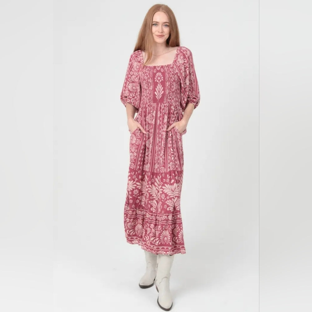 Chic mauve maxi dress with floral design. Features a flowing silhouette. Ideal for casual outings.