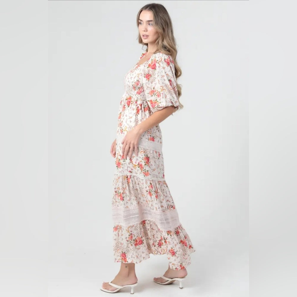 Chic floral maxi dress by Angie. Features a vibrant red and cream pattern. Ideal for casual outings or special events.