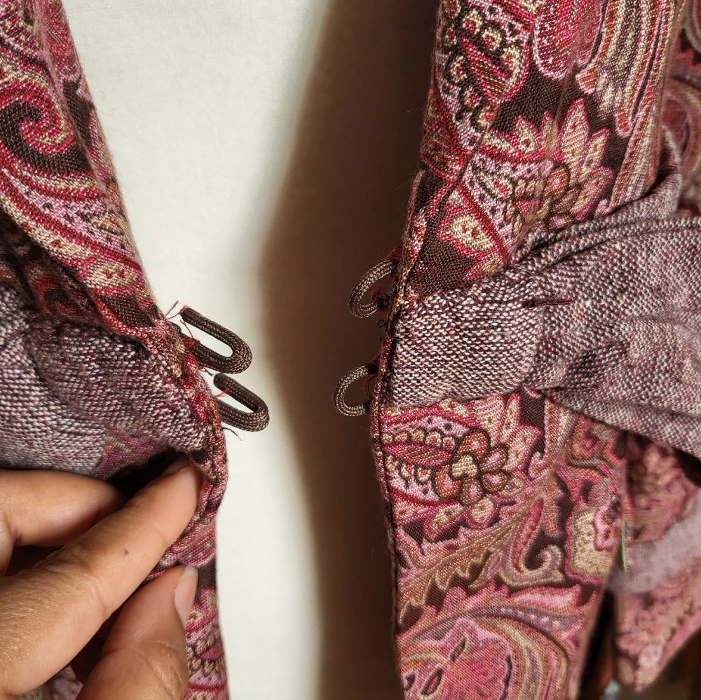 Stylish paisley blazer with a chic belt. Perfect for a sophisticated look.